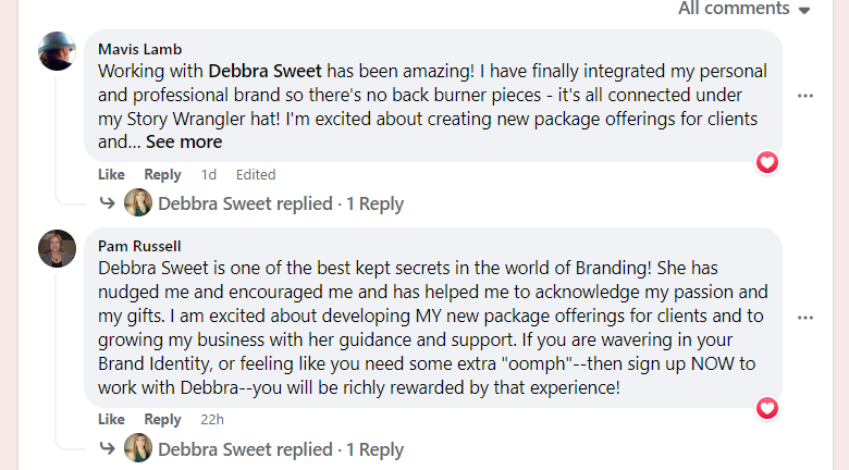 "Debbra is an amazing marketing and business coach. I attended her workshops and she suggested specific, creative ideas applicable to each individual's business as she discussed various topics. It's obvious that she is invested in everyone's success and has the talent to help them get there."