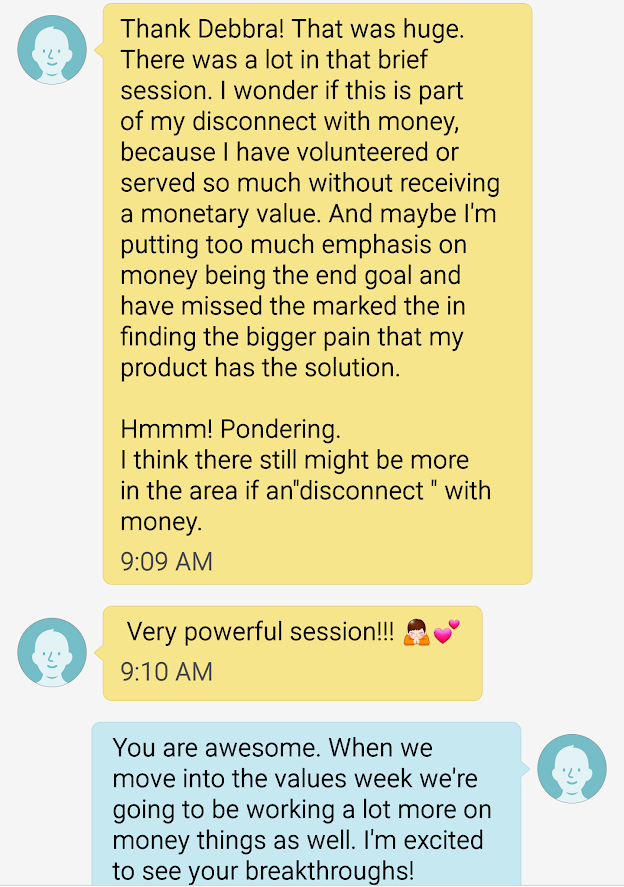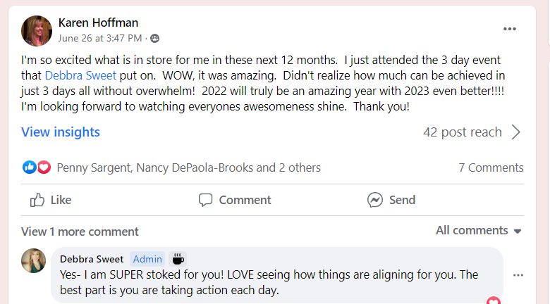 "Debbra, I’m not exactly sure what you did at the your women's event, but ever since that weekend, I find that I’m very positive, have let go of grudges, have reset my vision for my business and life goals to be bigger than I’ve ever considered! The best part… I’m really excited about it and already taking action to make this new vision reality!”